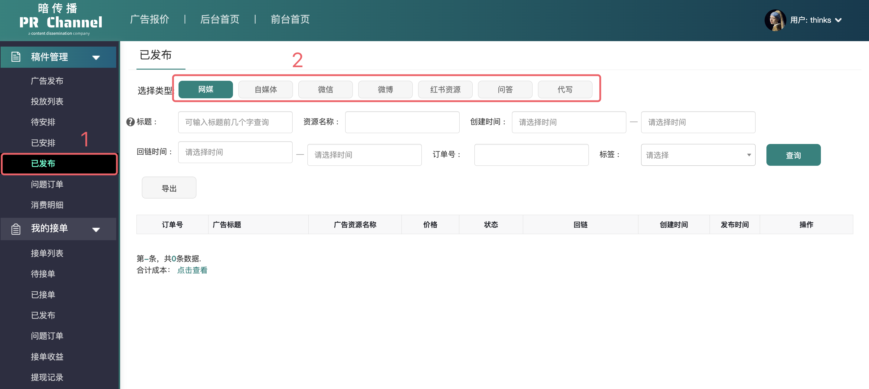 2、选择投稿订单的类型（网媒、自媒体、或者其他的）